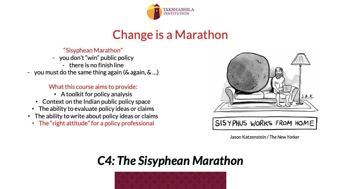 This slide from the Fundamentals of Public Policy module, co-anchored by Pranay Kotasthane and Ameya Naik gives a good idea of what the course has to offer.