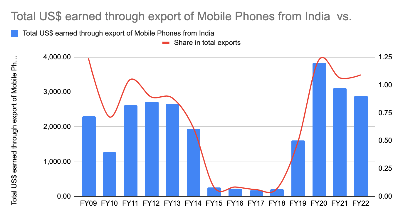 This is a crucial point. While the various incentives and protectionism has been successful to the extent that imports of phones have reduced, we are still far away from becoming a competitive exporter. Have a look at this chart I made from government data on mobile exports.