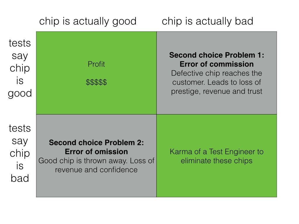 On the other hand, there is the second choice problem 2, where tests are designed so thoroughly that they start eliminating chips which are actually not dysfunctional. This is the Error of Omission. The cost involved with this error is that it leads to a loss of revenue as many good chips are just thrown away based on faulty tests. It also lowers the confidence of the firm.