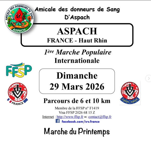 1ère Marche Populaire Internationale à Aspach avec l'Amicale des donneurs de Sang le 29 mars 2026