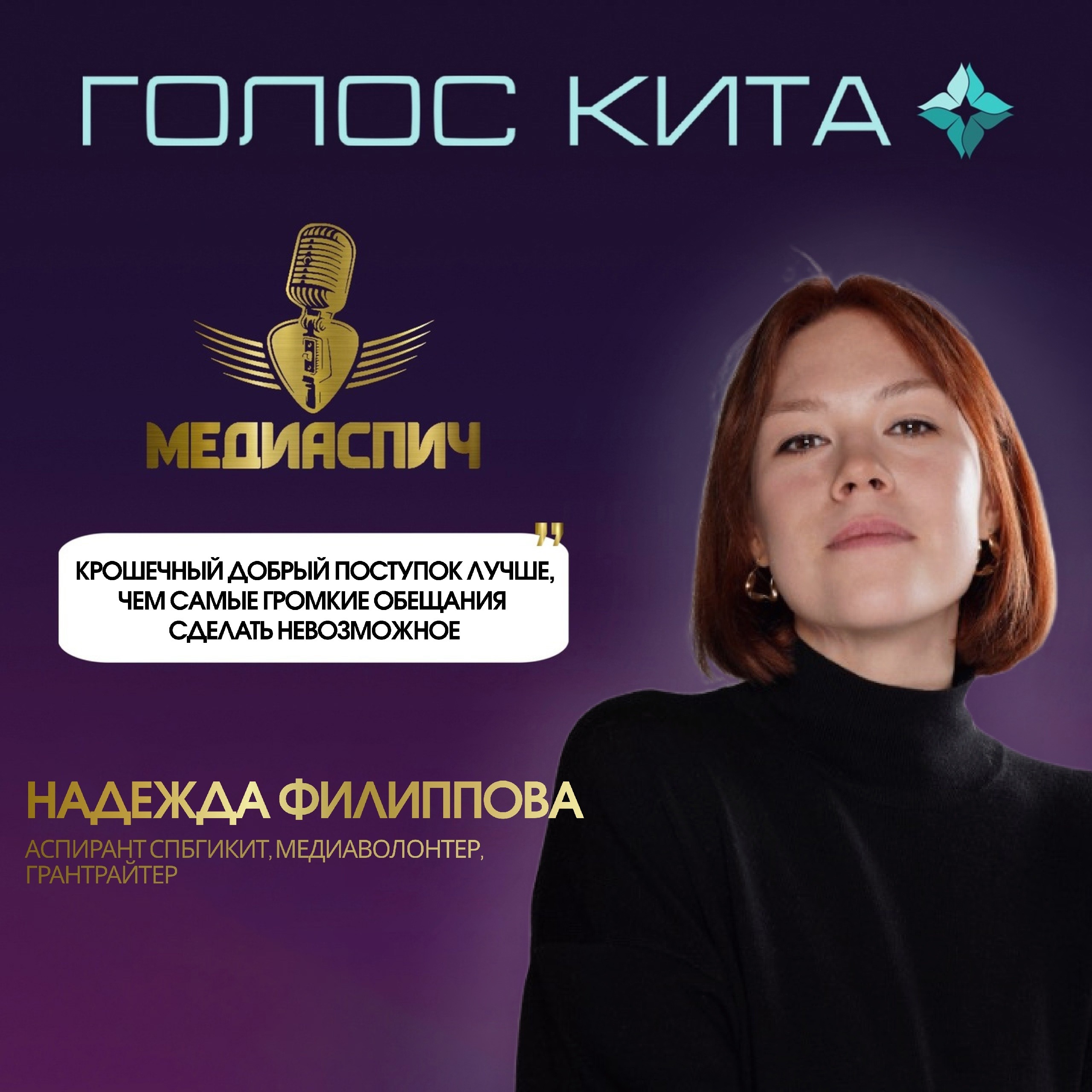 Надежда Филиппова – аспирант СПбГИКиТ, специалист по организации и проведению молодежных мероприятий «Подростково-молодежного центра Василеостровского района Санкт-Петербурга», куратор трека «Медиаволонтёрство» Добро Центра Василеостровского района, грантрайтер, победитель конкурса Росмолодежь. Гранты среди физических лиц 2024 года с медиапроектом «МЕDИАТОЧКА».