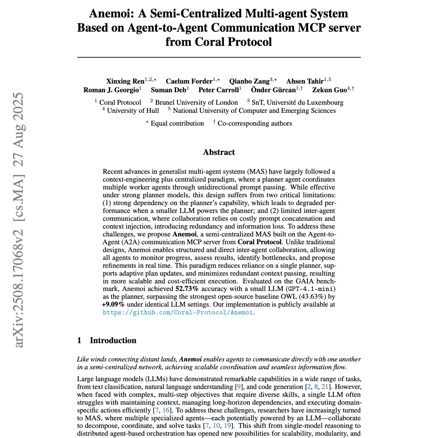 在 GAIA 基准测试上的评估结果表明,当使用小规模 LLM(GPT-4.1-mini)作为规划智能体时,Anemoi 取得了 52.73% 的准确率;在相同 LLM 设置下,该成绩相比最强的开源基线 OWL(43.63%)提升了 9.09 个百分点。我们的实现已在上述 https URL 上公开发布。