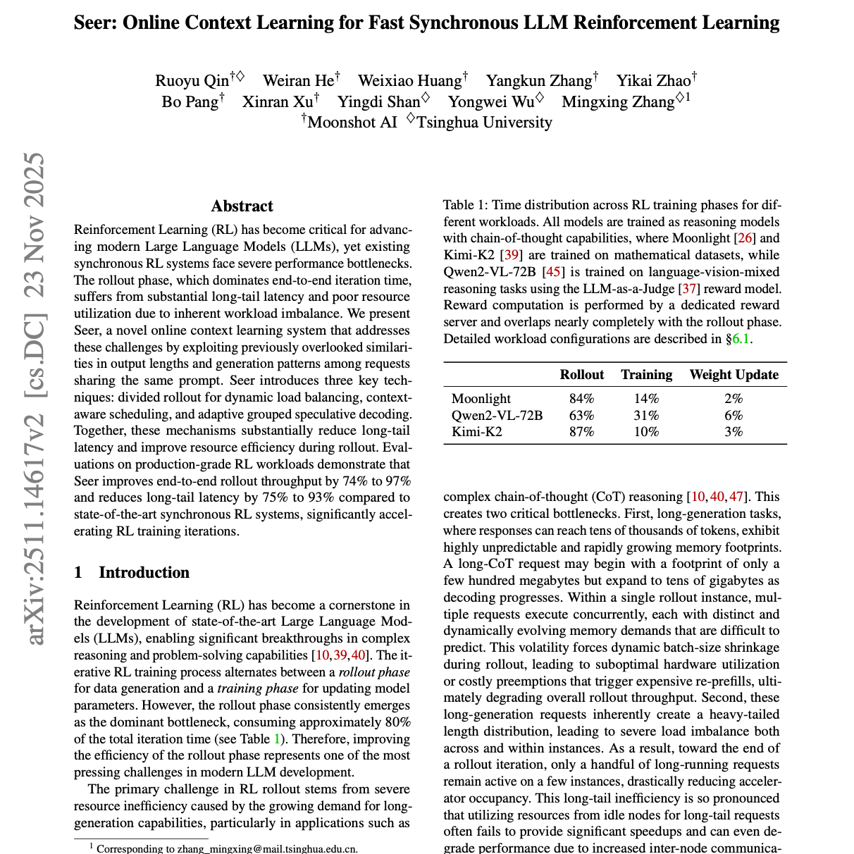 我们提出了 Seer,一种新颖的在线上下文学习系统,通过挖掘此前被忽视的特性来应对上述挑战:对于共享相同提示(prompt)的请求,其输出长度和生成模式之间往往具有高度相似性。基于这一观察,Seer 引入了三项关键技术:用于动态负载均衡的分割式 rollout、上下文感知调度,以及自适应的分组推测解码(speculative decoding)。