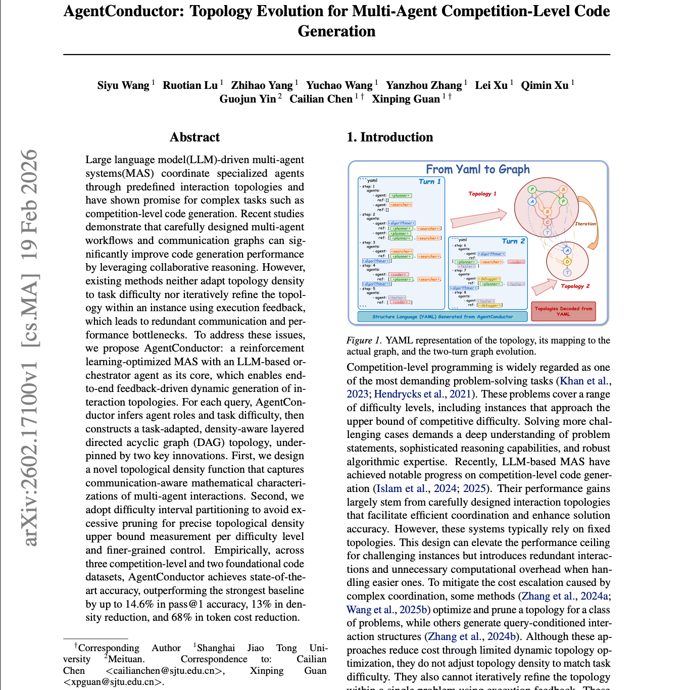 由大语言模型(LLM)驱动的多代理系统(MAS)通过预定义的交互拓扑结构协调专业代理,并在竞赛级代码生成等复杂任务中展现出巨大潜力。近期研究表明,精心设计的多代理工作流和通信图可以通过协作推理显著提升代码生成性能。