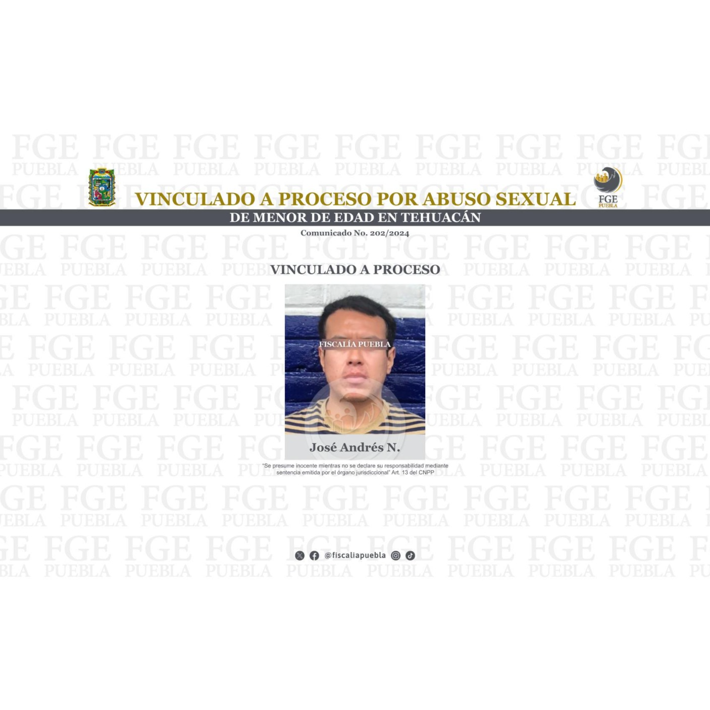 Con la exhibición de datos probatorios ante el Juez de Control, la Fiscalía General del Estado de Puebla obtuvo la vinculación a proceso de José Andrés N. de 23 años de edad, presunto responsable del delito de abuso sexual. El 26 de septiembre de 2024 policías municipales de Tehuacán detuvieron al imputado en la colonia Del Empleado, toda vez que era señalado de agredir sexualmente a una niña de 9 años. Al tomar conocimiento, la Fiscalía de Puebla inició la correspondiente carpeta de investigación y en el desahogo de la audiencia formuló imputación en contra de José Andrés N. El 03 de octubre de 2024 se obtuvo su vinculación a proceso con la medida cautelar de prisión preventiva oficiosa, otorgando el Juez de Control un plazo de 03 meses de investigación complementaria.