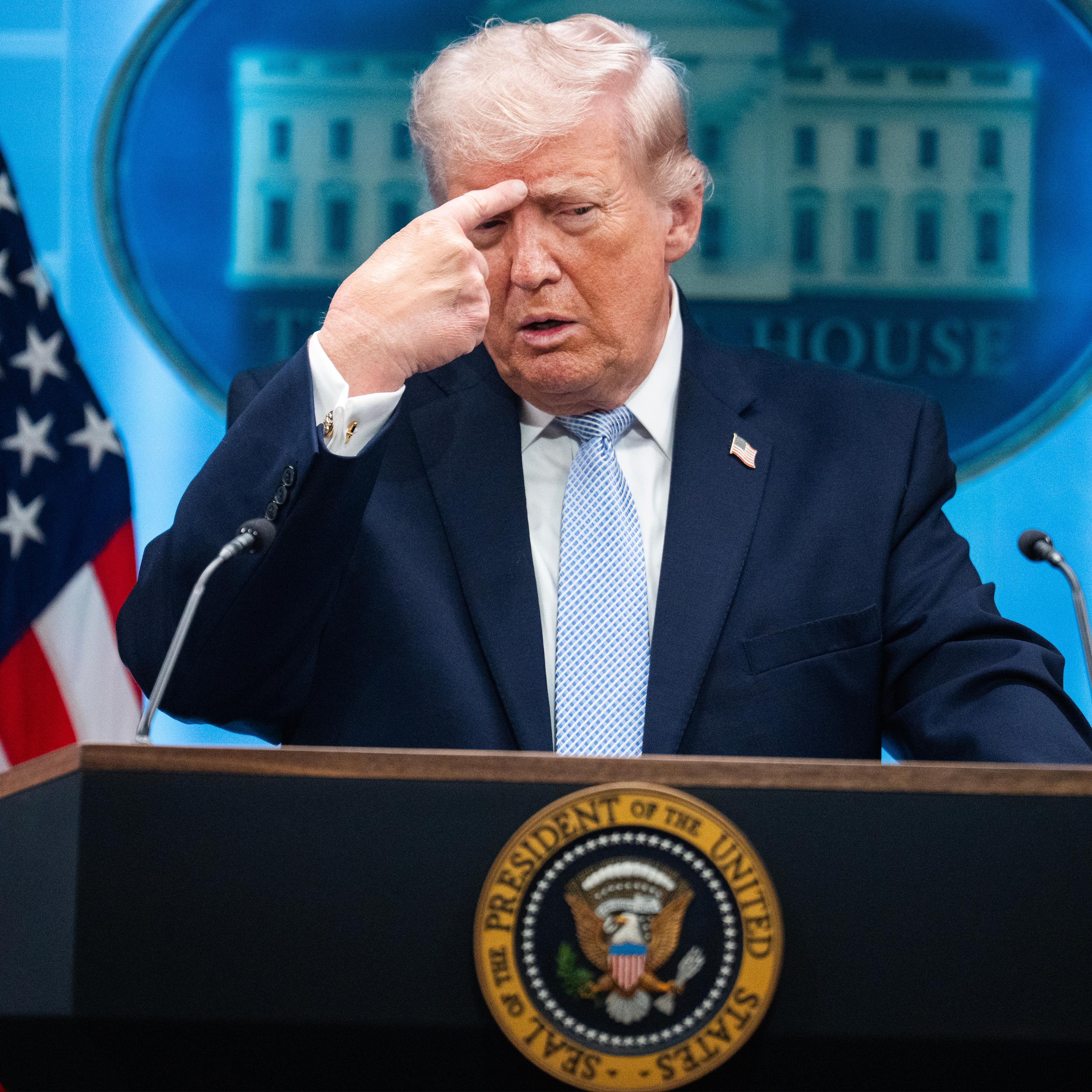 President Donald Trump mimics a Iranian protester being shot during a news conference about the war in Iran. Tom Williams/CQ-Roll Call, Inc via Getty Images.