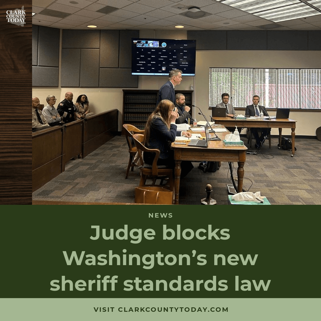 Four eastern Washington sheriffs successfully challenged a new state law requiring stricter qualifications for elected sheriffs, with Judge Christine Schaller ruling the Legislature may have exceeded constitutional authority. The preliminary injunction blocks key provisions of Senate Bill 5974 that would have created administrative pathways to remove elected sheriffs who fail to meet certification requirements. https://www.clarkcountytoday.com/news/judge-blocks-washingtons-new-sheriff-standards-law/ #Washington #Sheriff #Politics #LawEnforcement #Constitution #Election #ClarkCounty #CourtRuling #SB5974 #PublicSafety