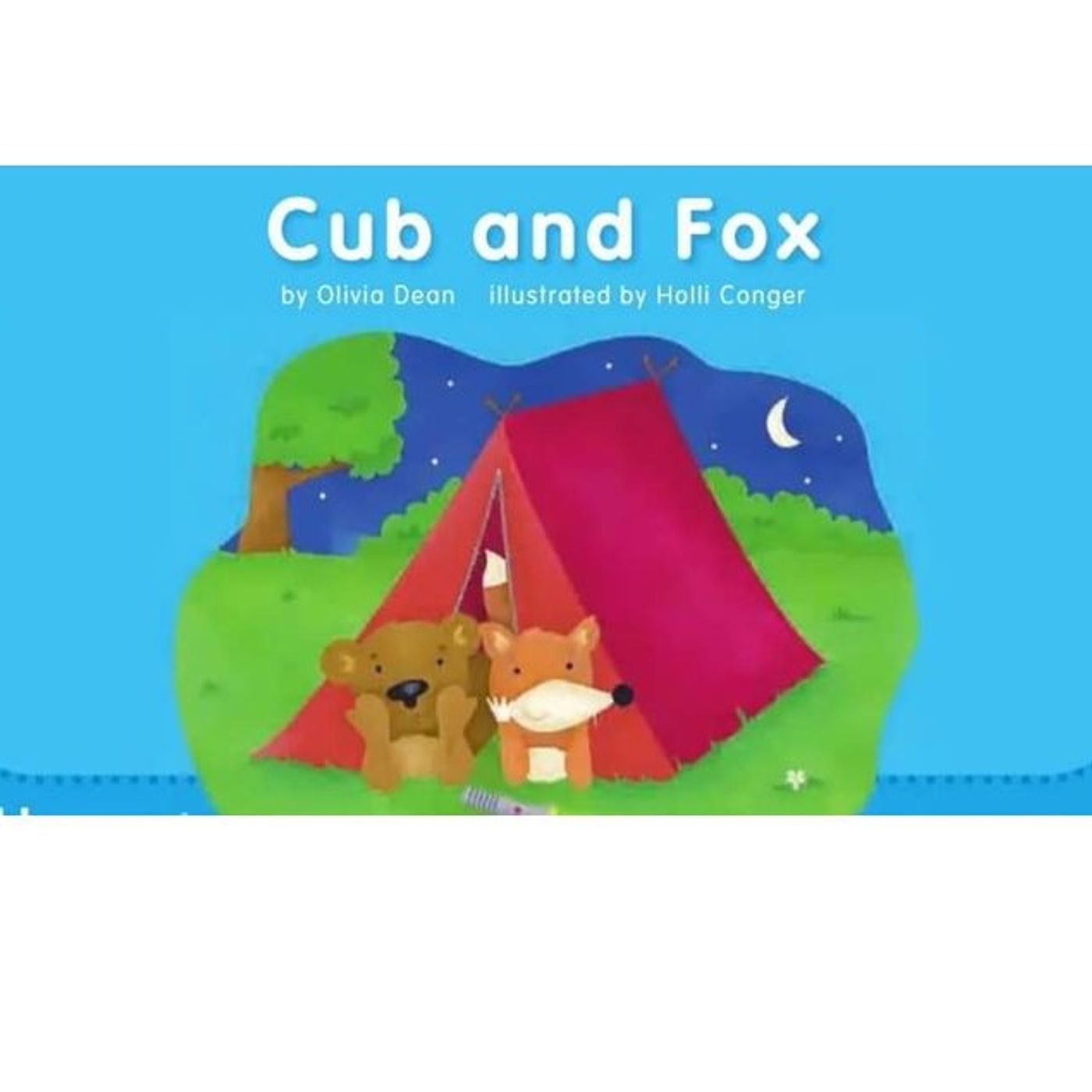 This children's story titled Cub and Fox follows a small bear and his friend as they spend a night camping in a tent. Throughout the evening, the Fox becomes repeatedly startled by various shadows and noises appearing outside their shelter. Each time the fox expresses fear, the Cub uses a flashlight to identify the source of the concern and reassure his friend. They discover that the perceived threats are merely a dog named Zip and a small spider spinning a web. The story concludes happily when the Cub's father arrives at the tent to bring the pair a tasty snack.