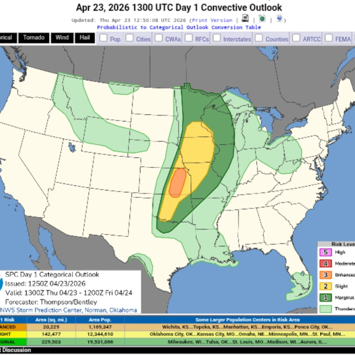 This urgent severe weather podcast, recorded on April 23, 2026, details a significant convective outlook from the Storm Prediction Center. A large portion of the Central United States, from the Southern Plains to the Upper Mississippi Valley, is at risk of severe thunderstorms, large hail, damaging winds, and tornadoes. The primary concern is an "enhanced risk" area centered on eastern Kansas and northern Oklahoma, where a "triple point" convergence of air masses is expected to create a highly volatile environment, with potential for "strong tornadoes" and very large hail. The podcast emphasizes safety, providing specific advice for both storm chasers and the general public.