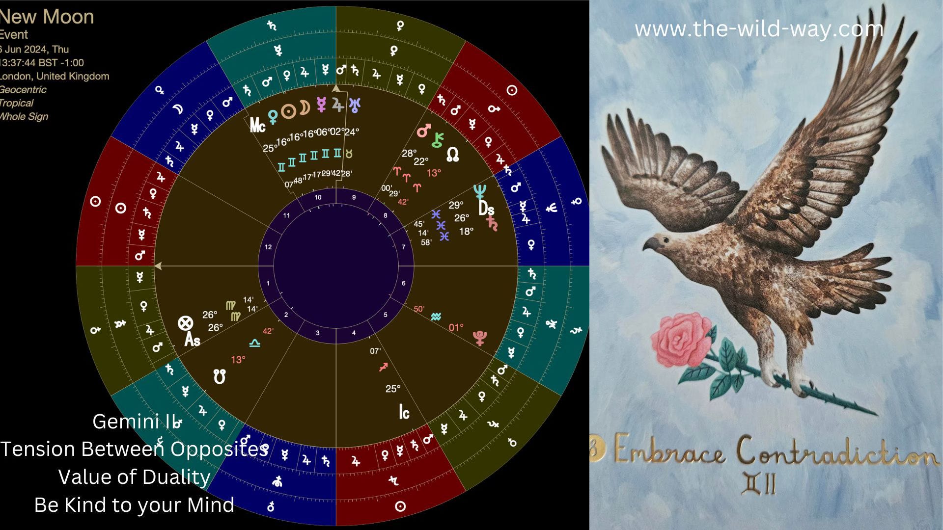 The Wild Way card, by Nicola Allan which is shown illustrates an Eagle soaring with a rose in its talons, inviting us to Embrace Contradictions. It reminds us that holding multiple viewpoints can be empowering. While some truths may be uncomfortable, navigating these polarities, the tension of opposites, with kindness towards ourselves can be key.