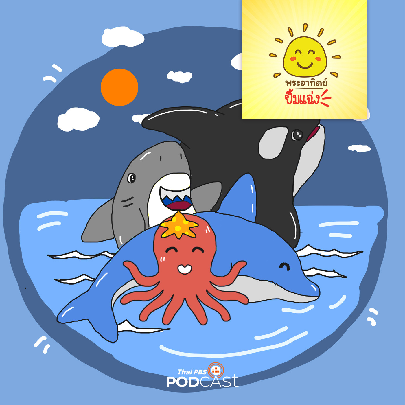 กลางมหาสมุทรที่กว้างใหญ่ ฉลามขาว วาฬออก้า และโลมา กำลังถกเถียงกันว่าใครจะเก่งกว่าใคร โลมาพูดเสียงดังขึ้นว่ามันได้ชื่อว่าเป็นสัตว์ที่มีความเฉลียวฉลาดและเป็นเพื่อนกับมนุษย์ โดยเฉพาะเวลาที่เรือแตกโลมาก็มักจะเข้าไปช่วยชีวิตมนุษย์ไว้ได้บ่อยๆ เล่าต่อเป็นตำนาน ระหว่างที่ทั้งสามกำลังถกเถียงกันก็มีลูกหมึกยักษ์หลงทางมา สามสหายจะทำอย่างไรและช่วยตามหาแม่หมึกยักษ์ได้หรือไม่ต่อไป ติดตามได้ในพระอาทิตย์ยิ้มแฉ่ง