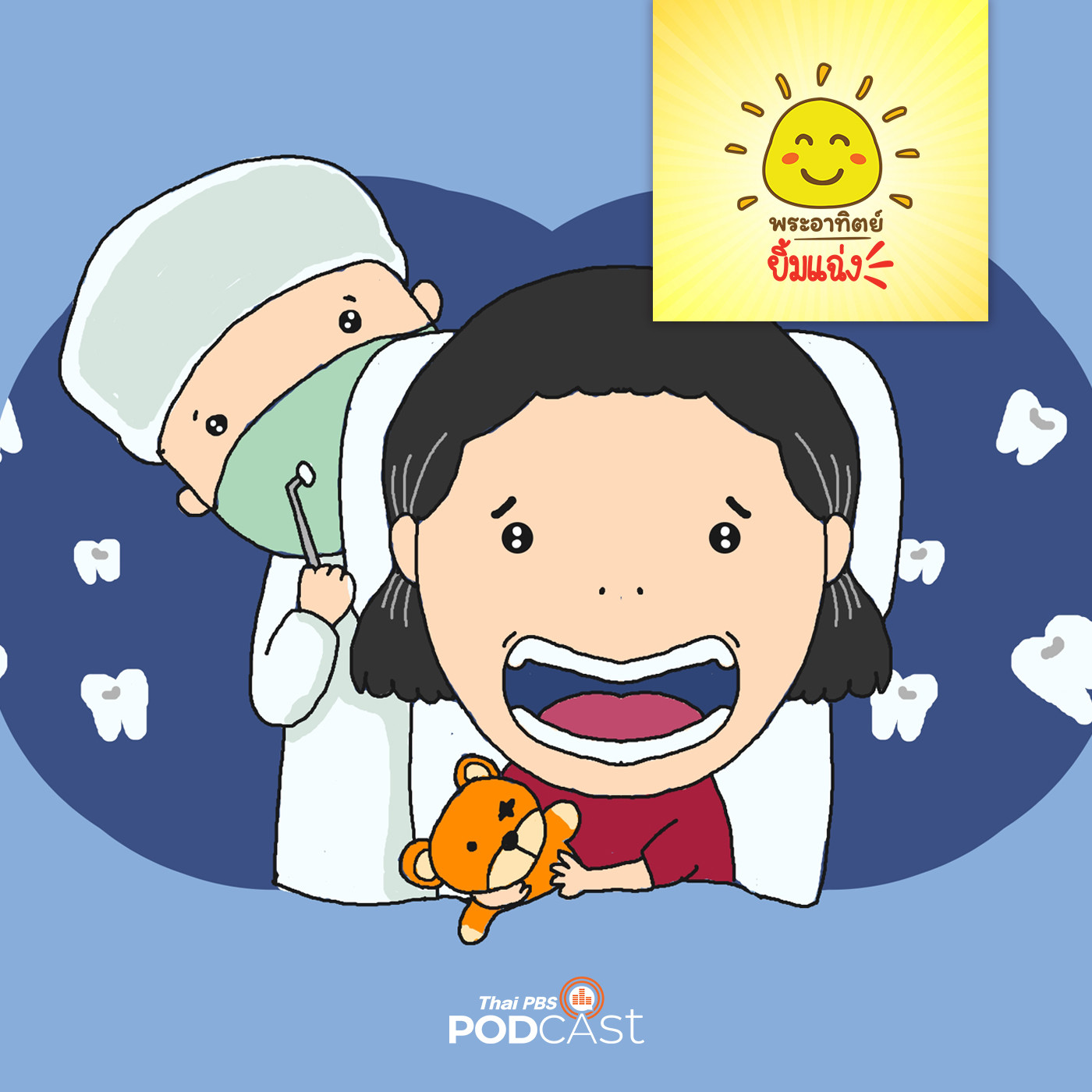 วันนี้เด็ก ๆ มีนัดกับหมอฟันแม่รู้ว่าน้องบอมกลัวหมอฟันมากที่สุดเพราะตั้งแต่เล็กก็ร้องงอแงตลอดทุกครั้งที่ไป “แม่ครับน้องบอมล่ะครับนึกว่าออกมาแล้ว” ทั้งหมดมองหาแต่ก็ไม่เห็น “นั่น ๆ ขาน้องค่ะ” แม่เดินไปหาน้องที่ซ่อนอยู่หลังต้นไม้ “ใครแอบอยู่ตรงนี้นะ” “ไม่มีใครครับ” น้องบอมบอก “ไปเถอะเราสายแล้วนะคุณหมอจะรอนาน” “ผมกลัว ผมกลัว เวลาไปหาหมอที่ไรผมร้องไห้ทุกทีเลย” น้องบอมร้องลั่นกอดต้นไม้แน่น “สงสัยต้องทำอะไรสักอย่าง พี่เบลจะทำอย่างไรติดตามได้ในรายการพระอาทิตย์ยิ้มแฉ่ง