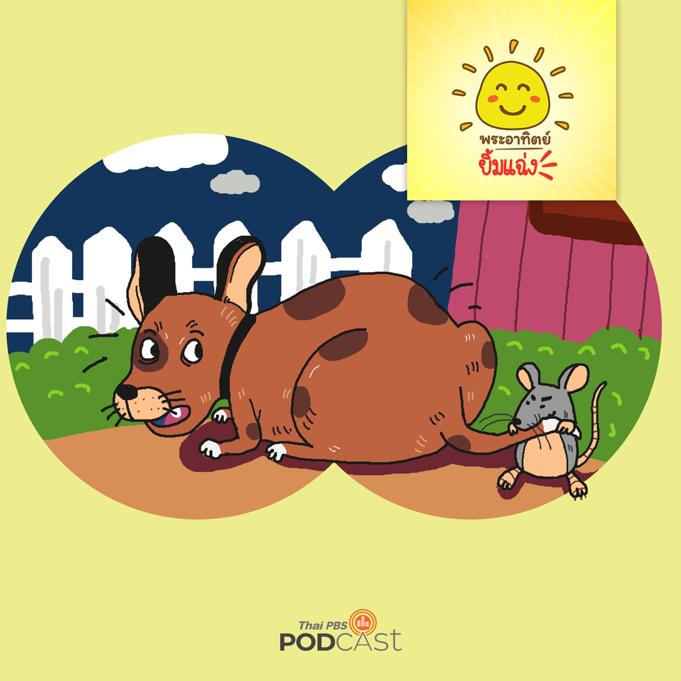 ในฟาร์มแห่งหนึ่งมีเจ้าตูบตัวหนึ่งทำหน้าที่เฝ้าดูแลความเรียบร้อยเป็นอย่างดีเพียงแต่เจ้าตูบตัวนี้มีนิสัยขี้โมโห หงุดหงิดง่ายโดยเฉพาะช่วงกลางวัน มันจะต้องงีบหลับถ้าถูกรบกวนล่ะก็จะโมโหเที่ยวไล่เห่าไปทั่ว วันหนึ่งมีเจ้าหนูมาใหม่มันขุดรูเล็กๆอาศัยอยู่ข้างที่นอนประจำของเจ้าตูบเพราะเจ้าหนูไม่รู้ถึงความขี้โมโหของเจ้าถิ่น มันจึงส่งเสียงจี๊ดๆวิ่งเล่นไปมาระหว่างที่เจ้าตูบนอนกลางวัน “ใครส่งเสียงอะไรน่ารำคาญจริงๆ โฮ่ง โฮ่ง โฮ่ง ๆ” เจ้าตูบเริ่มเห่าไม่หยุดมันวิ่งวนไปทั่วแต่ก็ไม่เจอต้นเหตุเพราะเจ้าหนูวิ่งหลบเข้าไปในรูเสียก่อน เจ้าตูบจะทำอย่างไรกับเจ้าหนูติดตามได้ในรายการพระอาทิตย์ยิ้มแฉ่ง