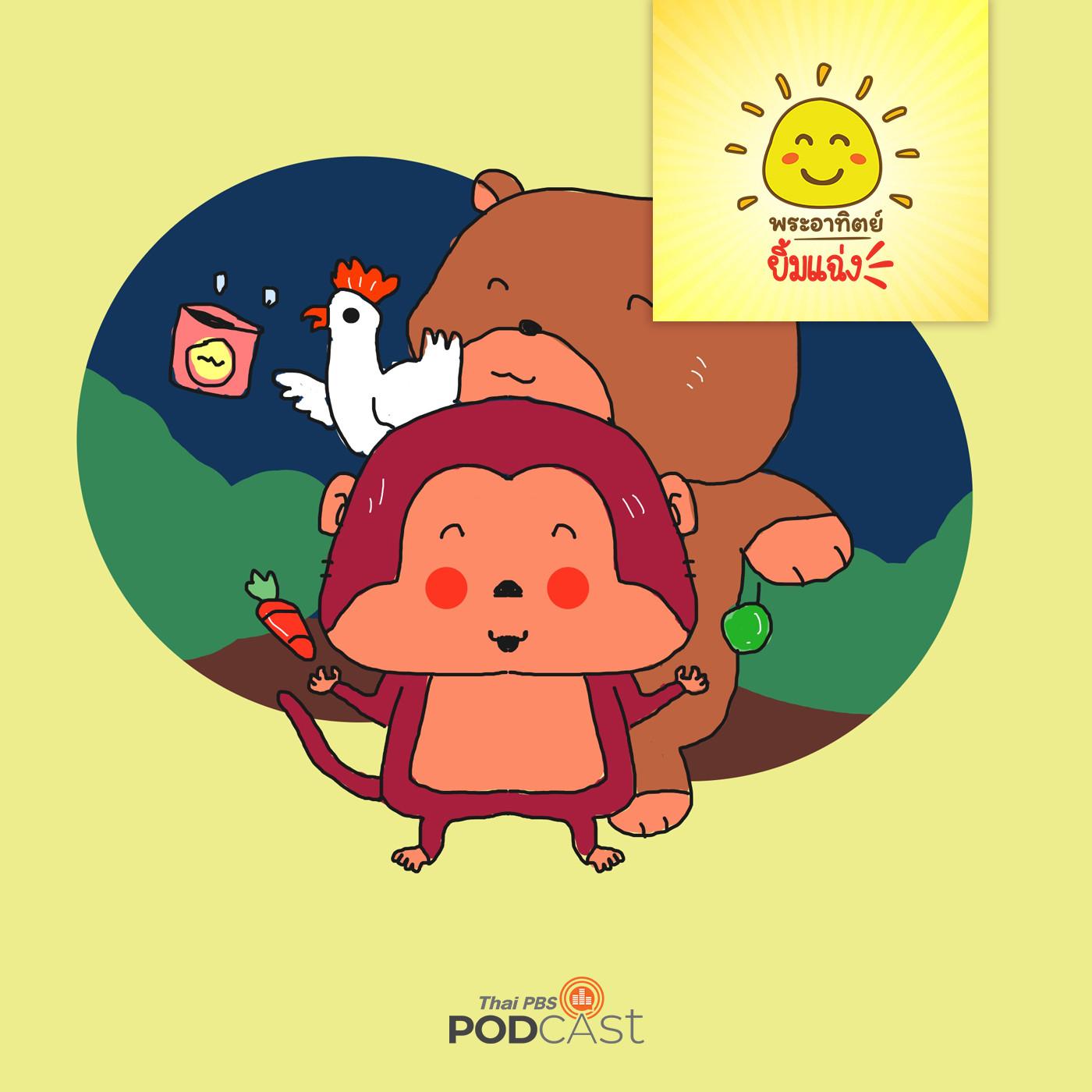 ณ สนามเด็กเล่นในหมู่บ้านแสนสุข ลิงน้อย หมีอ้วน และ ไก่โต้ง กำลังเล่นเครื่องเล่นอย่างสนุกสนาน พร้อมทั้งมีขนมกรุบกรอบและน้ำหวานหลากสีที่พร้อมจะหยิบกินได้ทันทีที่ต้องการ แต่หมีอ้วนกับลิงน้อยยังเถียงกันเรื่องอ้วนหรือไม่อ้วน และบอกไม่ให้หมีอ้วนกับไก่โต้งกินของที่ไม่มีประโยชน์ “นี่...ลิงน้อย หมีอ้วน อย่ามัวเถียงกันอยู่เลย มากินขนมกันเถอะ วันนี้ไก่โต้งเอาขนมมาฝากด้วยล่ะ นี่ไง...มีลูกข่างสีสวย เป็นของแถมอยู่ในถุงขนมด้วย” ลิงน้อยบ่นไก่โต้งว่า ชอบซื้อขนมเอาของแถม ว่าแต่ทำไมลิงน้อยต้องบ่นเรื่องการกินของหมีอ้วนและลิงน้อย ติดตามได้ในรายการพระอาทิตย์ยิ้มแฉ่ง