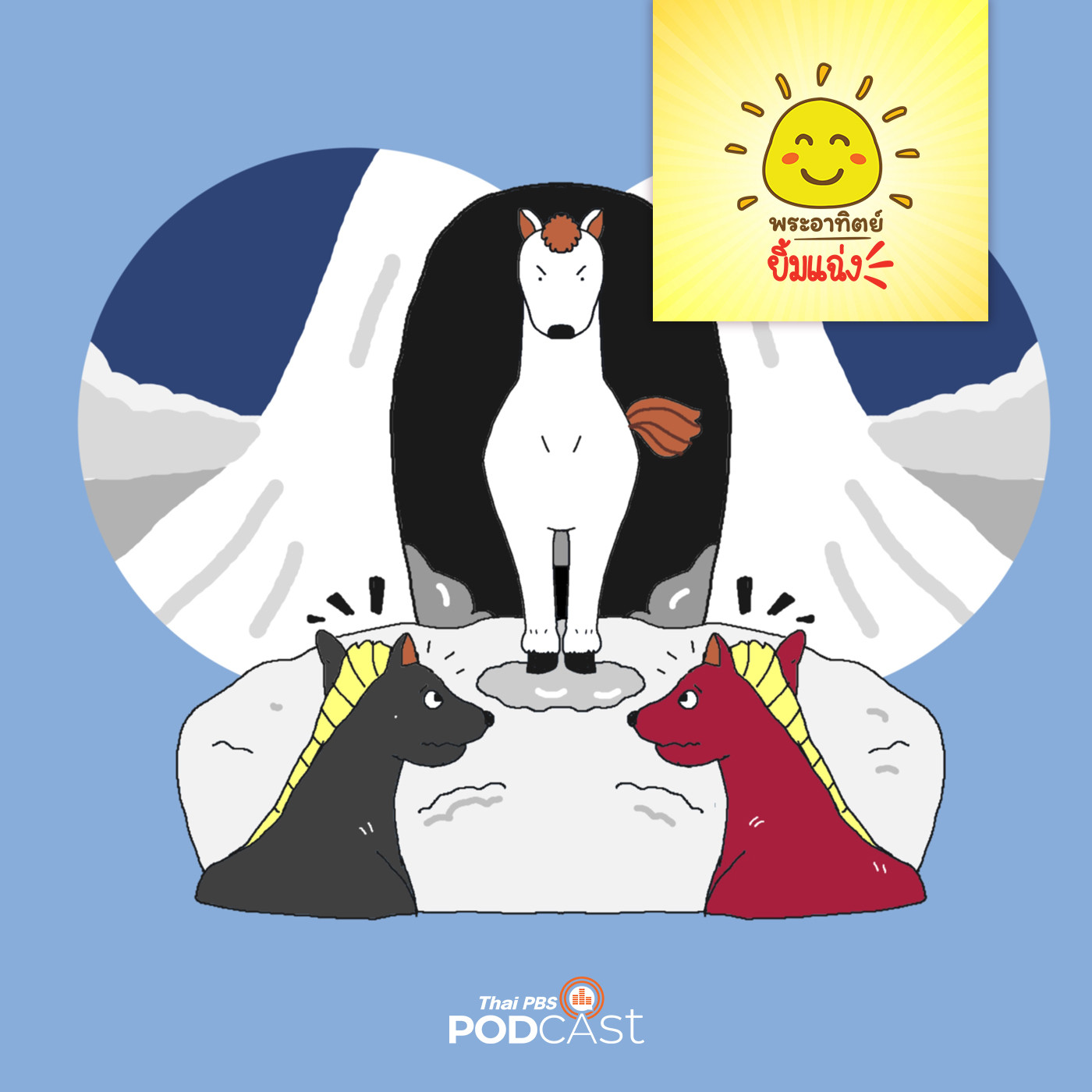 ณ ถ้ำบนภูเขาสูงแห่งหนึ่ง ซี่งมีม้าอาศัยอยู่ร่วมกันเป็นจำนวนมาก โดยมีม้าขาวเป็นหัวหน้าฝูงที่แสนจะเจ้าระเบียบเป็นที่สุด ม้าขาวจะคอยสั่งการให้ทุกตัวทำหน้าที่ให้ดีซึ่งมันก็มีเหตุผลในการสั่งให้ลูกน้องทำงานทุกอย่าง ในขณะที่ม้าแดง และ ม้าดำแอบบ่นบ่อย ๆ ว่าหัวหน้าใช้งานพวกมันหนักเกินไปเหนื่อยจะแย่ และคิดว่าทำไมพวกมันต้องทำงานหนัก มันทั้งสองตัวจึงตกลงว่าจะเลิกฟังคำสั่งหัวหน้า ม้าแดงกับม้าดำจึงหนีไปเที่ยว ทิ้งให้เพื่อน ๆ ม้าตัวอื่นทำงานกันต่อไปเมื่อความมืดและความหนาวมาเยือน จนหิมะเริ่มตกลงมาปกคลุมม้าแดงกับม้าดำจึงรีบวิ่งหนีความหนาวเย็นไปยังถ้ำเมื่อไปถึงหน้าถ้ำก็ เจอกับม้าขาวยืนประจันหน้าขวางทางเข้าอยู่ ม้าดำกับม้าแดงจึงตกใจมาก ทำไมหัวหน้าจึงใช้ให้ลูกน้องทำงานหนัก ติดตามได้ในรายการพระอาทิตย์ยิ้มแฉ่ง