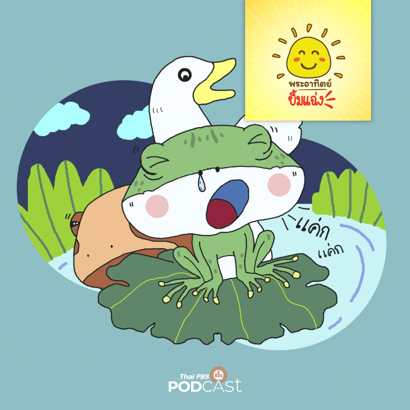 ณ บึงใหญ่กลางป่าแสนสุข ที่นี่มีต้นไม้ใหญ่จำนวนมากทำให้บรรยายกาศรอบ ๆ บึงร่มรื่น และเป็นช่วงปลายฝนต้นหนาวอากาศเปลี่ยนแปลงอย่างรวดเร็วทำให้สัตว์ที่อาศัยอยู่บริเวณนั้นเริ่มป่วย กบ อึ่งอ่าง และ เป็ดน้อย ที่มักจะมากระโดดน้ำเล่น ต่างส่งเสียงไอ และมีเสียงพูดแหบแห้ง กบน้อยกระโดดน้ำไปก็บ่นว่าเจ็บคอ ทำให้อึ่งอ่างและเป็ดน้อยเป็นห่วงโดยเฉพาะเรื่องการหาอาหารกินได้อย่างไร แต่กบน้อยจะใช้วิธีอ้าปากแล้วรอให้แมลงบินเข้าปากมันเอง เพราะหวังว่าแมลงจะเป็นใจกบที่ป่วยอย่างมัน อึ่งอ่างและเป็ดน้อยพยายามบอกว่าคงไม่มีแมลงตัวไหนยอมบินเข้าปากมัน จะมีแมลงตัวไหนบินเข้าปากกบน้อยหรือไม่ติดตามได้ในรายการพระอาทิตย์ยิ้มแฉ่ง