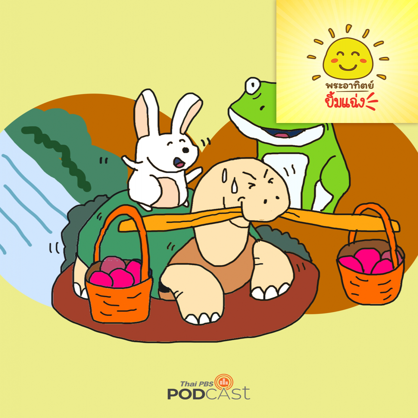 ณ ป่าอันกว้างใหญ่แห่งหนึ่ง แบ่งพื้นที่ป่าเป็นป่าตะวันออกและป่าตะวันตก ที่ป่าตะวันออกมีกระต่ายตัวหนึ่งมันคิดว่ามันอาศัยอยู่ที่นี่มานาน แต่ยังไม่เคยไปเที่ยวที่ป่าตะวันตกเลย มันอยากเห็นว่าป่าตะวันตกเป็นยังไง มีผลไม้ให้กินเยอะไหม มันจึงคิดอยากจะไปดูสักครั้ง แต่การจะข้ามไปป่าตะวันตกได้ต้องข้ามลำธารที่มีกระแสน้ำไหลเชี่ยว มันจึงไปหาเจ้าเต่า เพื่อชวนข้ามไปด้วยกัน เมื่อตกลงกันได้แล้ว วันรุ่งขึ้นเจ้าเต่ากับเจ้ากระต่ายก็ได้ข้ามลำธารไปยังป่าตะวันตก โดยมีเจ้ากระต่ายนั่งบนหลังเจ้าเต่า เจ้าเต่าว่ายน้ำฝ่ากระแสน้ำเชี่ยวในลำธารอยู่นานก็มาถึง เจ้ากระต่ายตื่นเต้นมากที่ได้เห็นผืนป่าอันอุดมสมบูรณ์ ทั้งสองจะทำอย่างไร ติดตามได้ในรายการพระอาทิตย์ยิ้มแฉ่ง