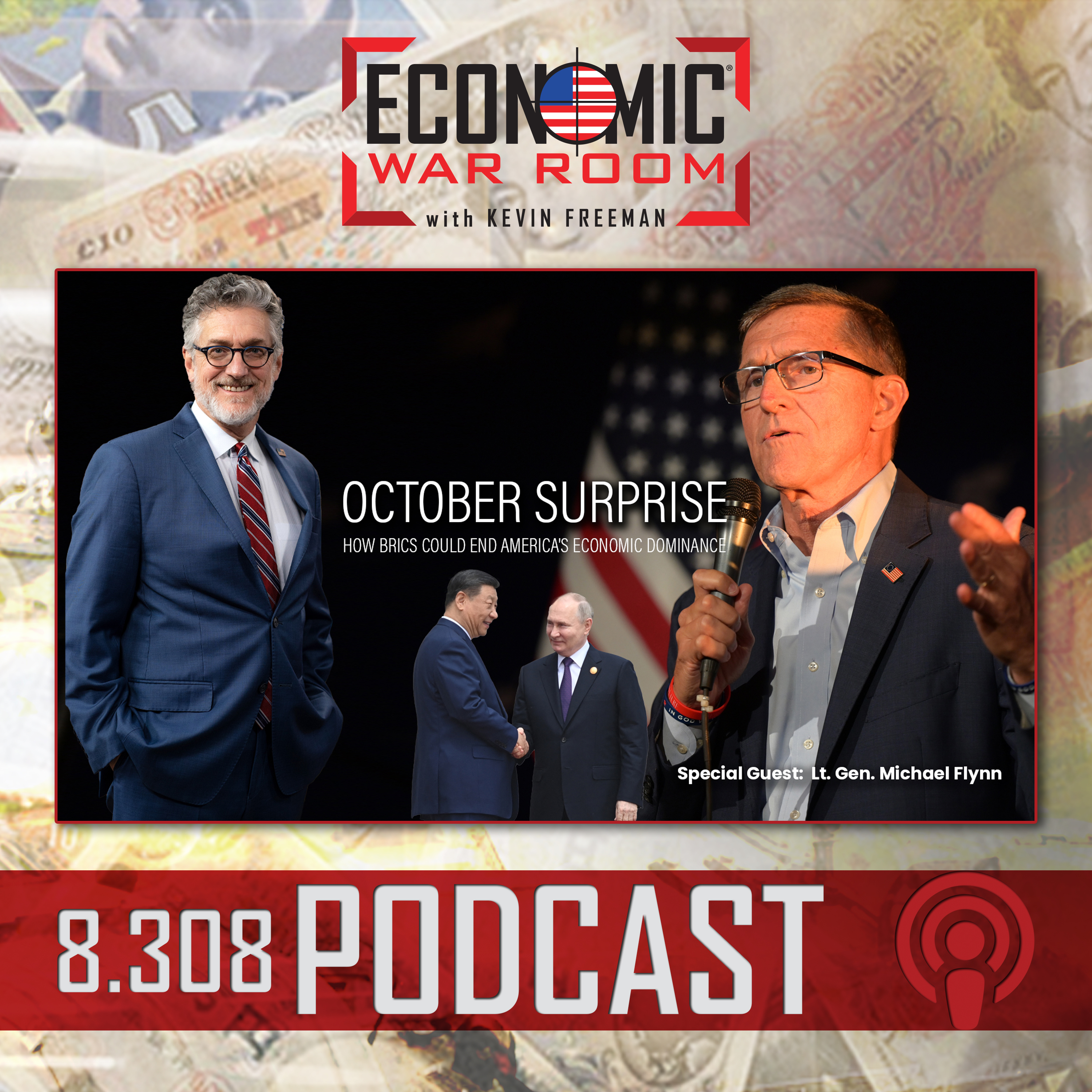 Former national security adviser Lt. Gen. Michael Flynn joins Kevin Freeman to discuss a potential October surprise orchestrated by the BRICS nations that could dethrone the American dollar. They explore economic warfare, historical lessons from fallen empires, and the looming threat of central bank digital currencies. Flynn emphasizes the need for Americans to become proactive in safeguarding their economic future and calls for increased local civic involvement. Freeman concludes with actionable steps for Americans to prepare and respond to these global economic shifts.