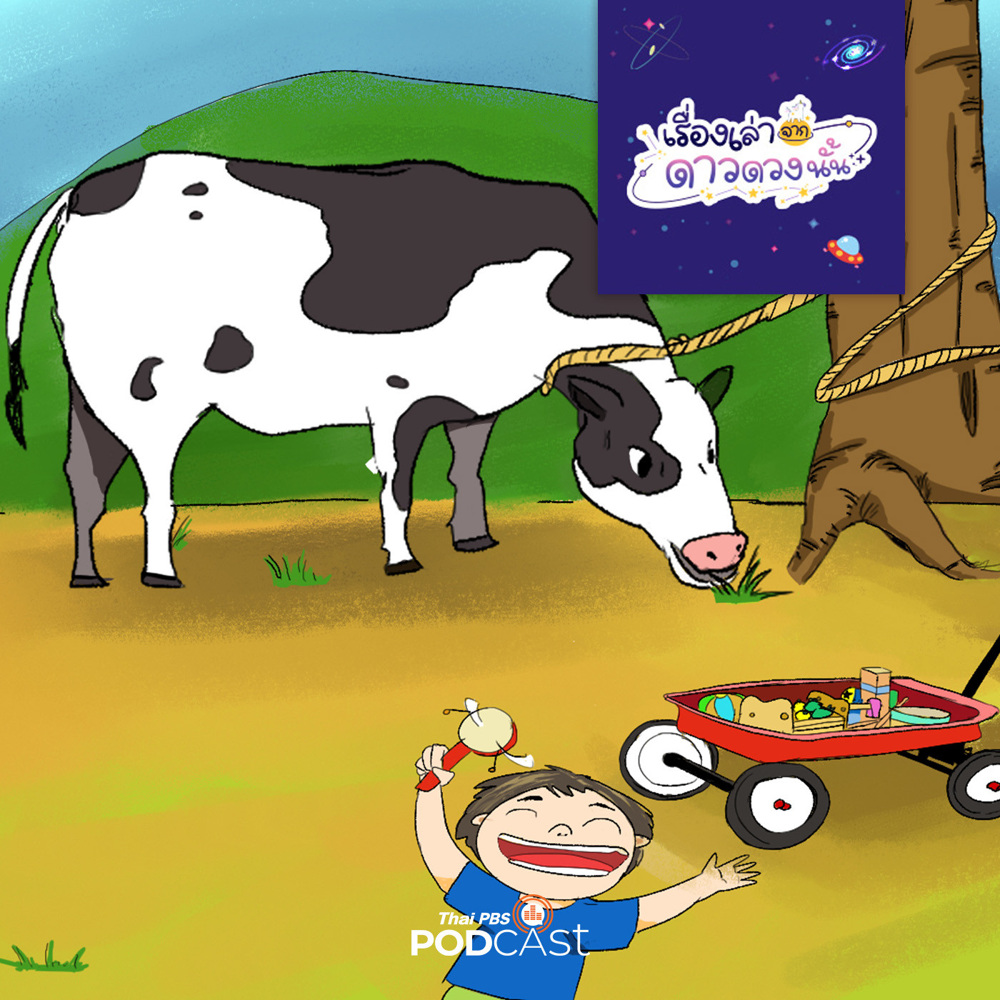 ณ ดาวสีรุ้ง ที่ทุกอย่างมีสีสันสวยงาม มีแม่กับลูกคู่หนึ่ง ช่วยกันทำมาหากินโดยเอาของไปขายที่ตลาด วันหนึ่งแม่ได้มอบหมายให้ “คิว” ผู้เป็นลูกชายมีหน้าที่รับผิดชอบดูแลวัว ตอนแรกคิวตื่นเต้นดีใจกับหน้าที่นี้เป็นอย่างมาก จึงดูแลวัวเป็นอย่างดี แต่นานวันเข้า คิวเริ่มละเลยหน้าที่ของตนจนทำให้วัวล้มป่วย ไม่สามารถเทียมเกวียนเอาของไปขายที่ตลาดได้ แล้วแบบนี้คิวจะทำยังไงดีนะ มาฟังนิทานกันเลย