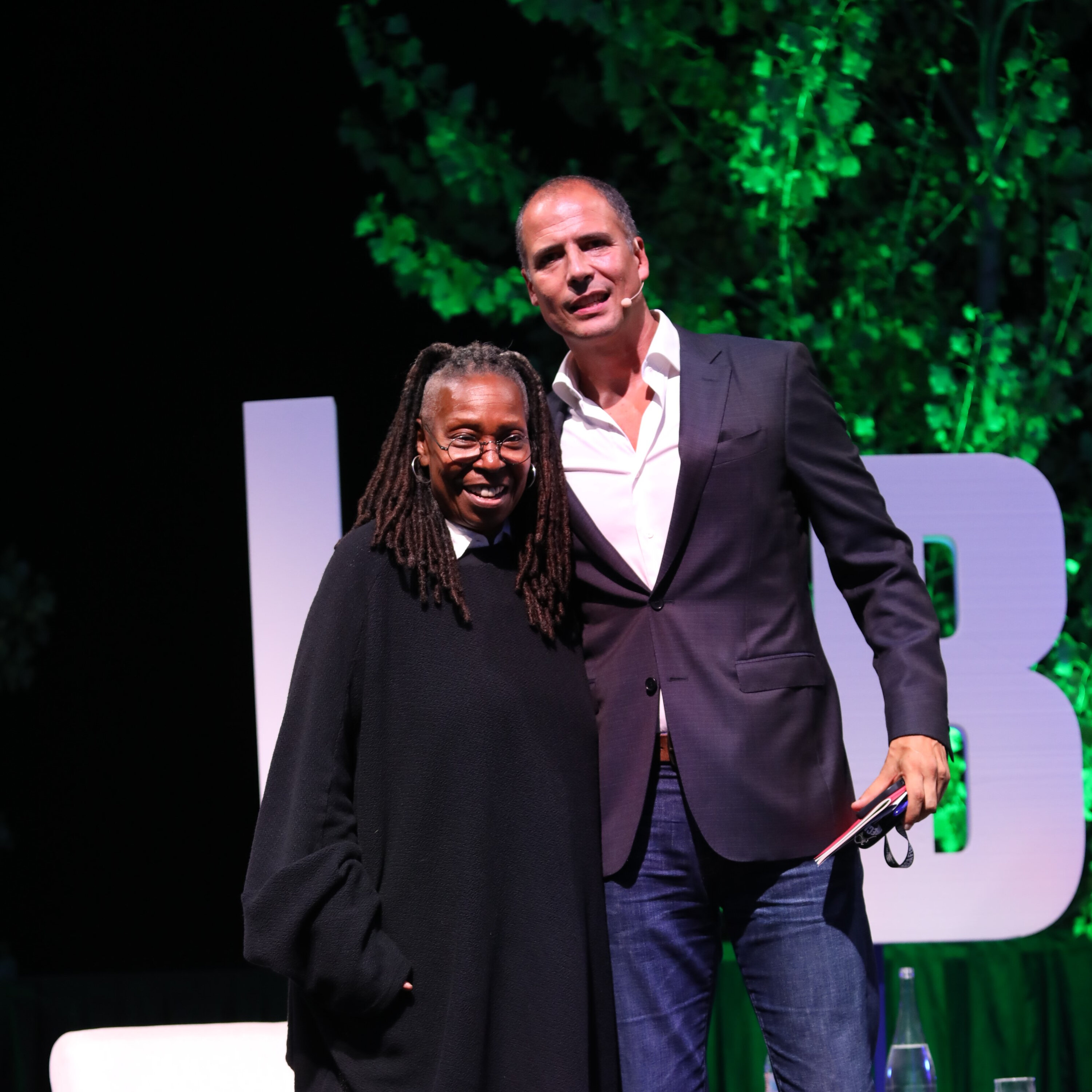 Whoopi Goldberg, vencedora de um Emmy, um Grammy, um Oscar, um Tony, dois Globos de Ouro e do Mark Twain Prize for American Humor, conversa com Ricardo Araújo Pereira, vencedor do troféu de melhor marcador do campeonato inter-turmas do Externato da Luz, em 1989, ao serviço do 9° B.