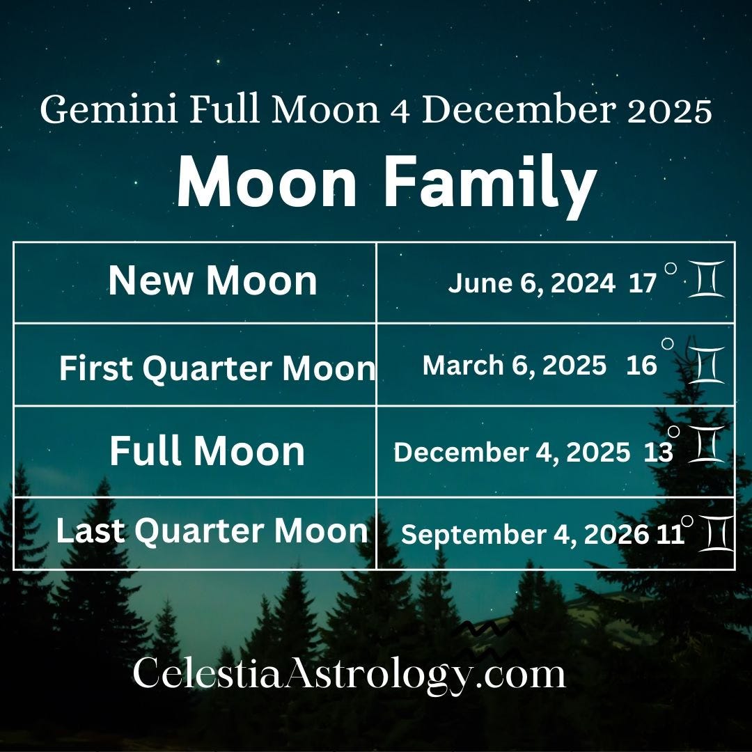 This Full Moon at 13° Gemini is the third chapter in what astrologers call a Moon Family. This is a concept outlined by Dietrich Pessin in her book “Lunar Shadows III.” Understanding this timeline transforms this single night from a moment into a greater journey, showing you exactly where you are in a much larger story of mental and emotional evolution.