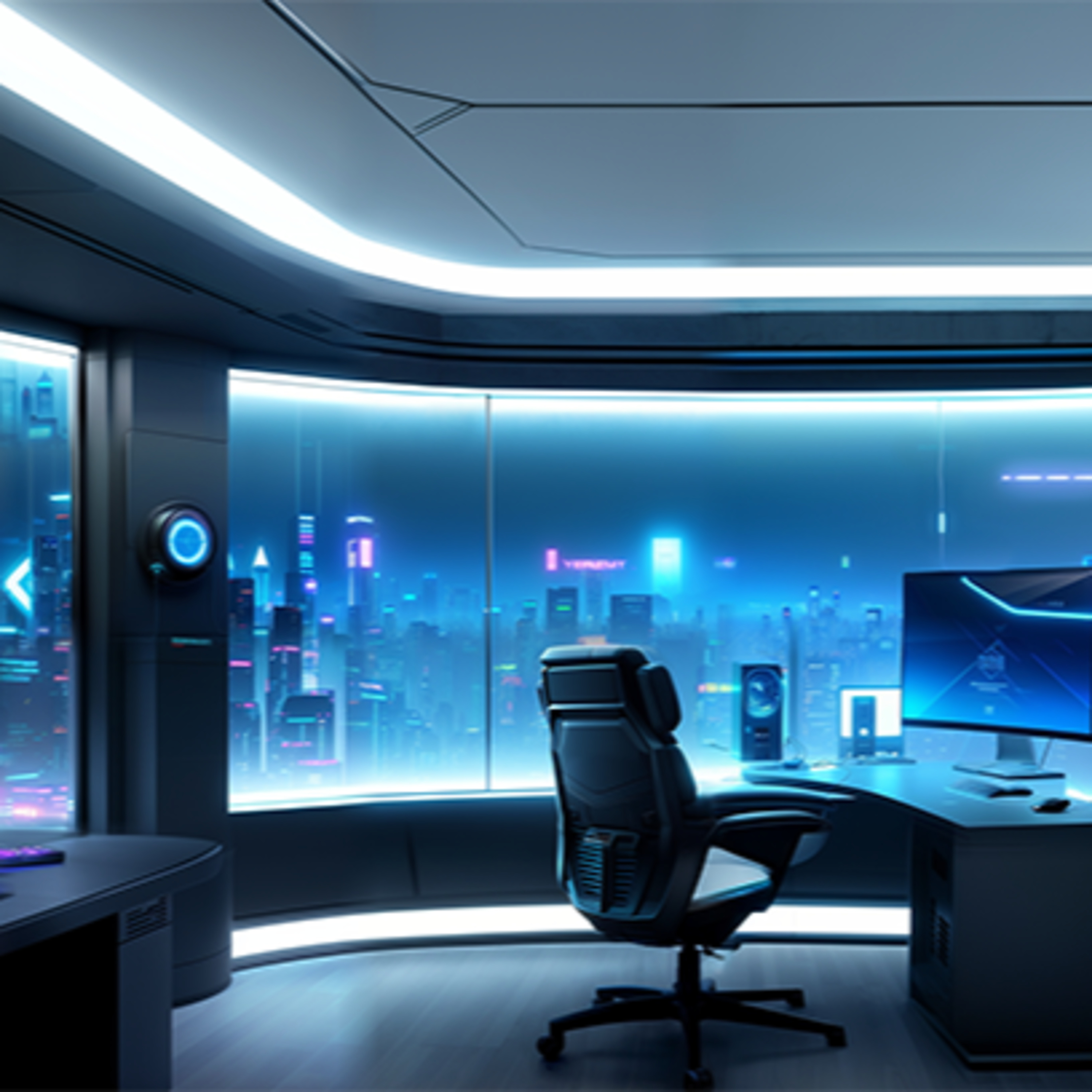 Your futuristic modern loft is the perfect place to kick back and relax, featuring a breathtaking view of the sprawling metropolis landscape and a calm ambient atmosphere.