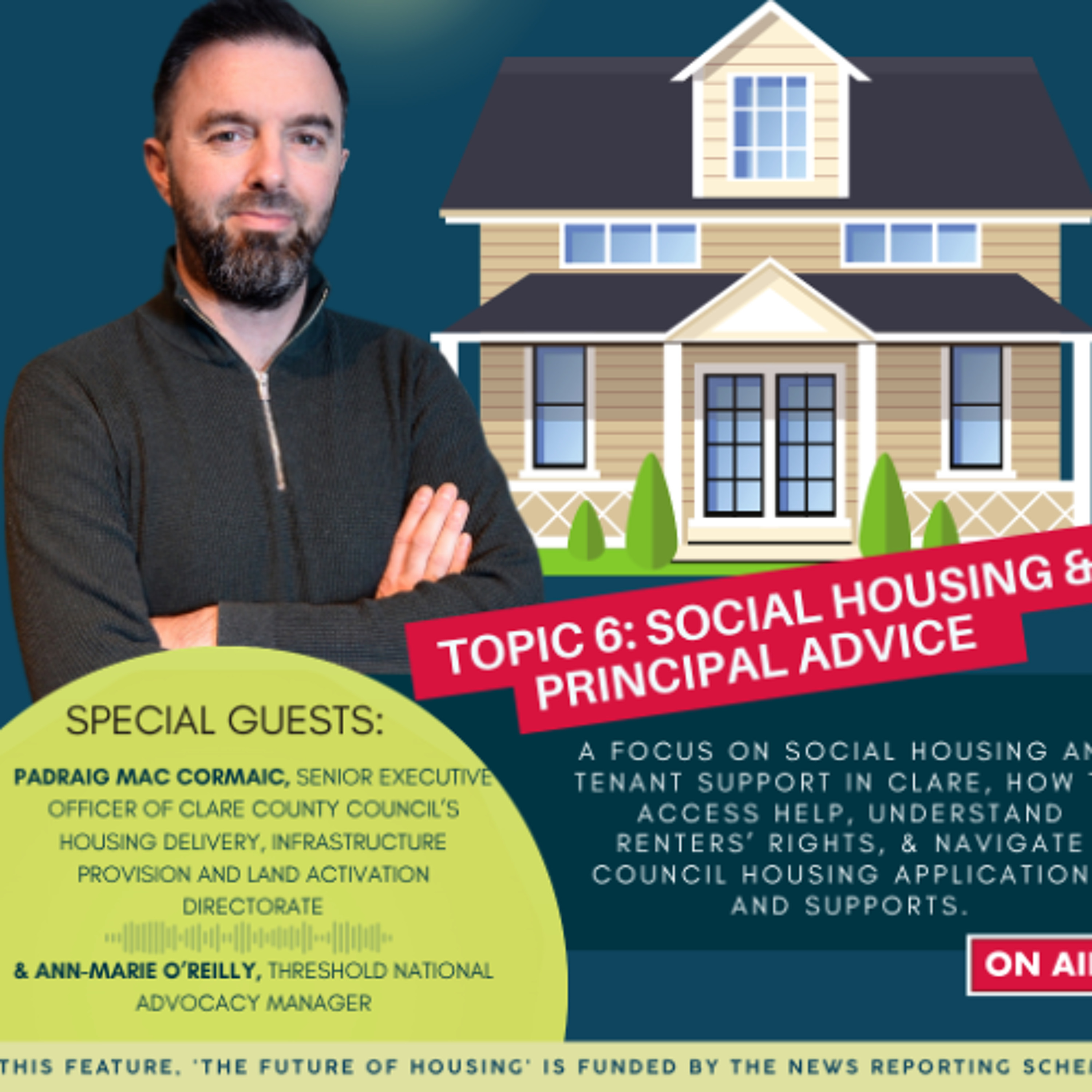 This week on The Future of Housing, Alan Morrissey was joined by Padraig Mac Cormaic, Senior Executive Officer of Clare County Council’s Housing Delivery, Infrastructure Provision and Land Activation Directorate. Also joining the discussion was Ann-Marie O’Reilly, Threshold National Advocacy Manager. Together, they explored the topic of social housing and tenant support. The conversation focused particularly on tenant support in Clare, how to access help, understand renters’ rights, & navigate council housing applications and supports. This feature, 'The Future of Housing' is funded by the News Reporting Scheme. Image © Clare Fm
