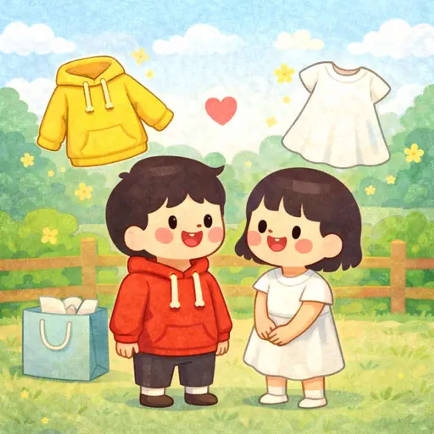 小宝 is wearing new clothes. 小美 thinks they look nice, and they talk about clothes together.