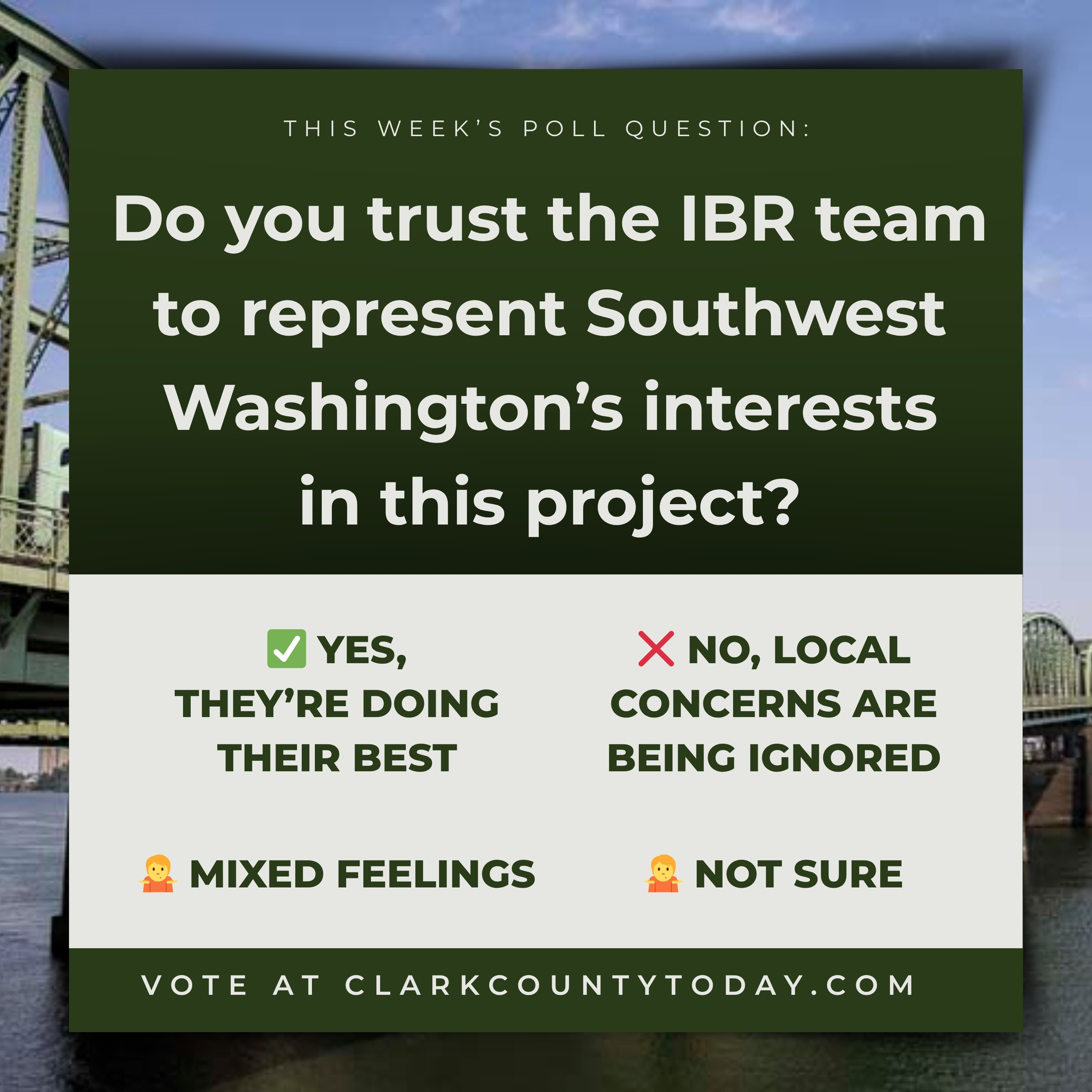 A new Clark County Today poll asks whether Clark County taxpayers should fund light rail operations tied to the I-5 Bridge Replacement. Project leaders say the plan is moving forward, but questions remain over long-term costs and public support. https://www.clarkcountytoday.com/opinion/poll-should-clark-county-taxpayers-help-pay-for-light-rail-operations/ #InterstateBridge #LightRail #ClarkCounty #Transportation #CTRAN #Taxpayers #GregJohnson #Opinion