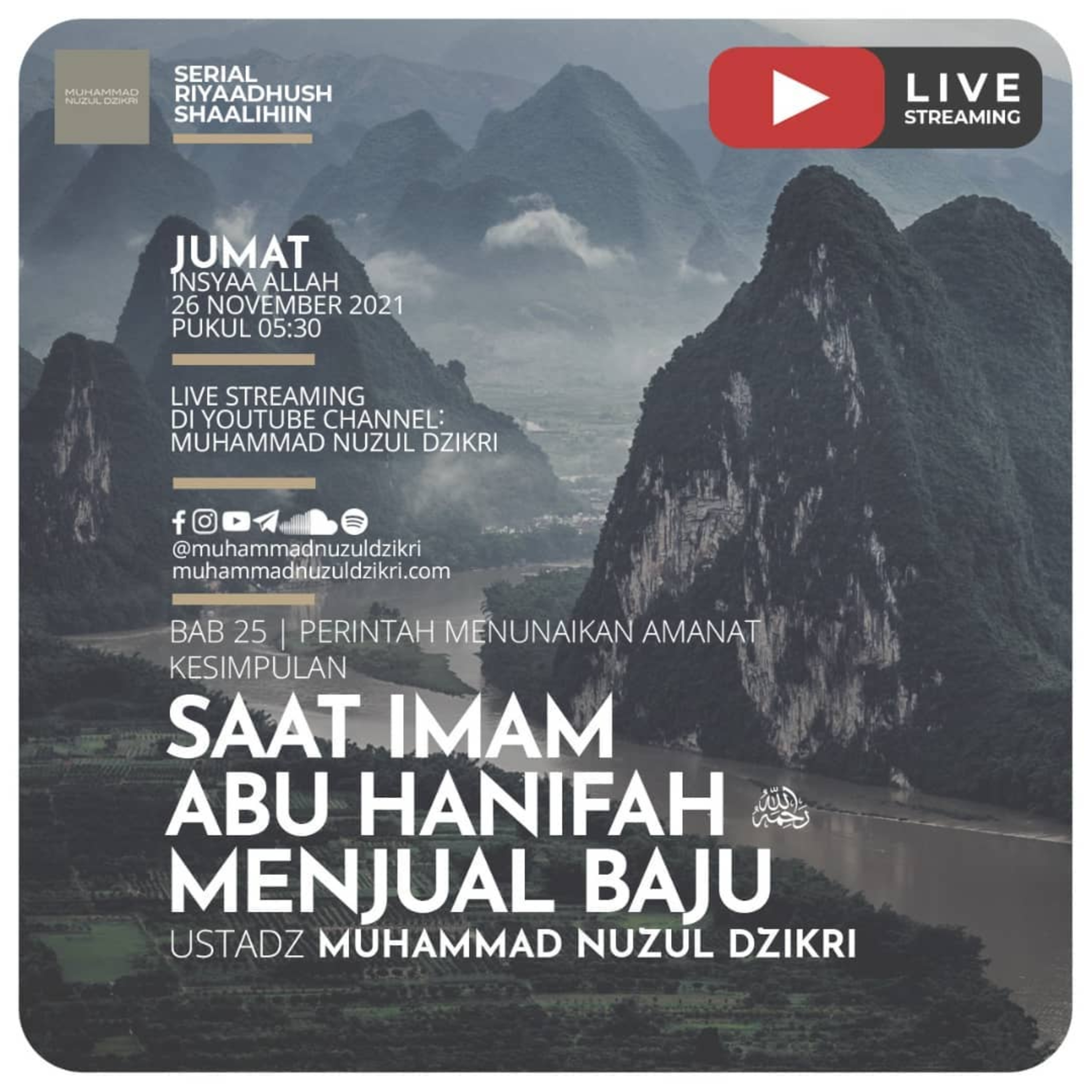 🖥️ Insyaa ALLAH ditayangkan langsung di https://www.youtube.com/c/MuhammadNuzulDzikri/ (pada channel YouTube insyaa ALLAH akan terdapat sebuah video dengan logo "LIVE").