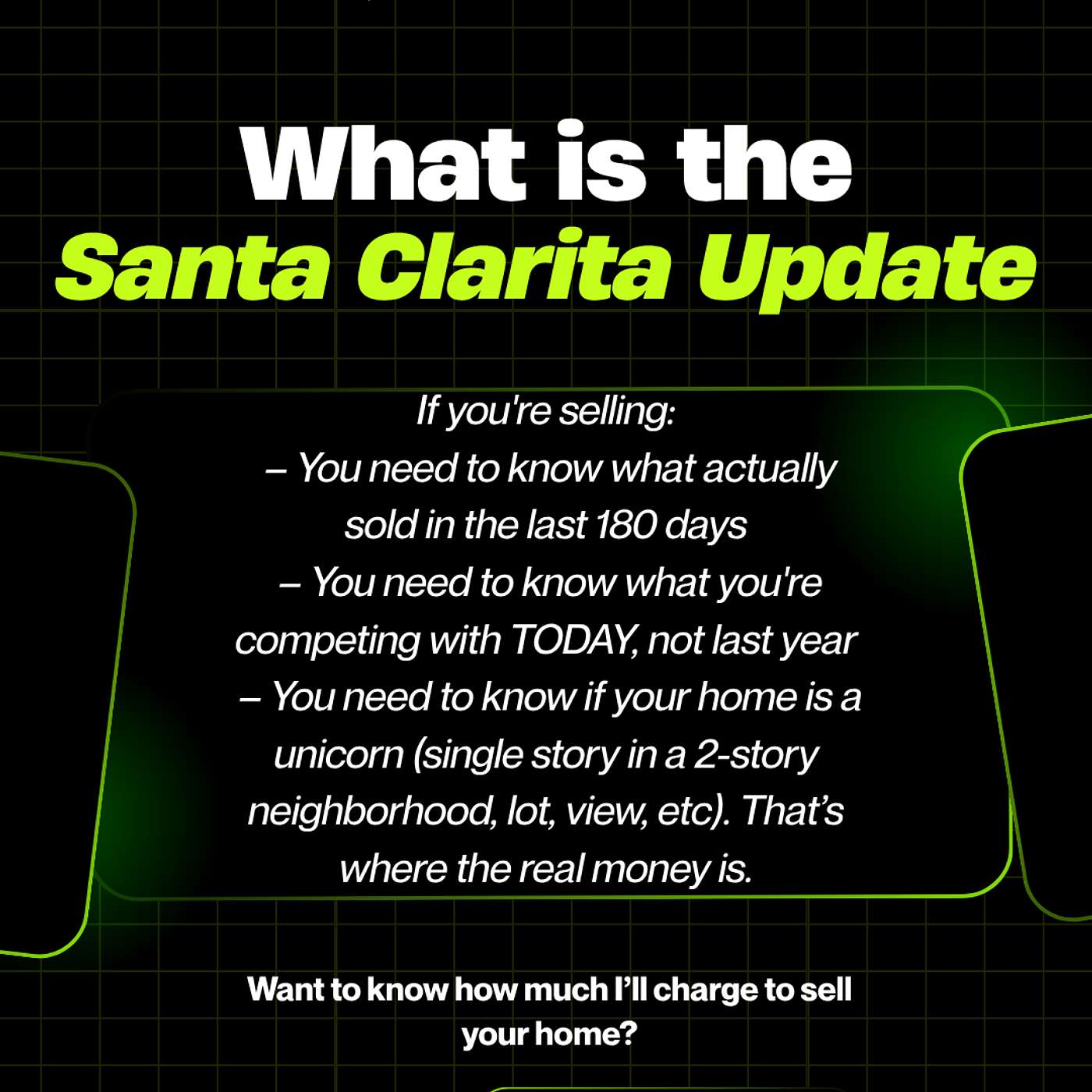 – You need to know if your home is a unicorn (single story in a 2-story neighborhood, lot, view, etc). That’s where the real money is.