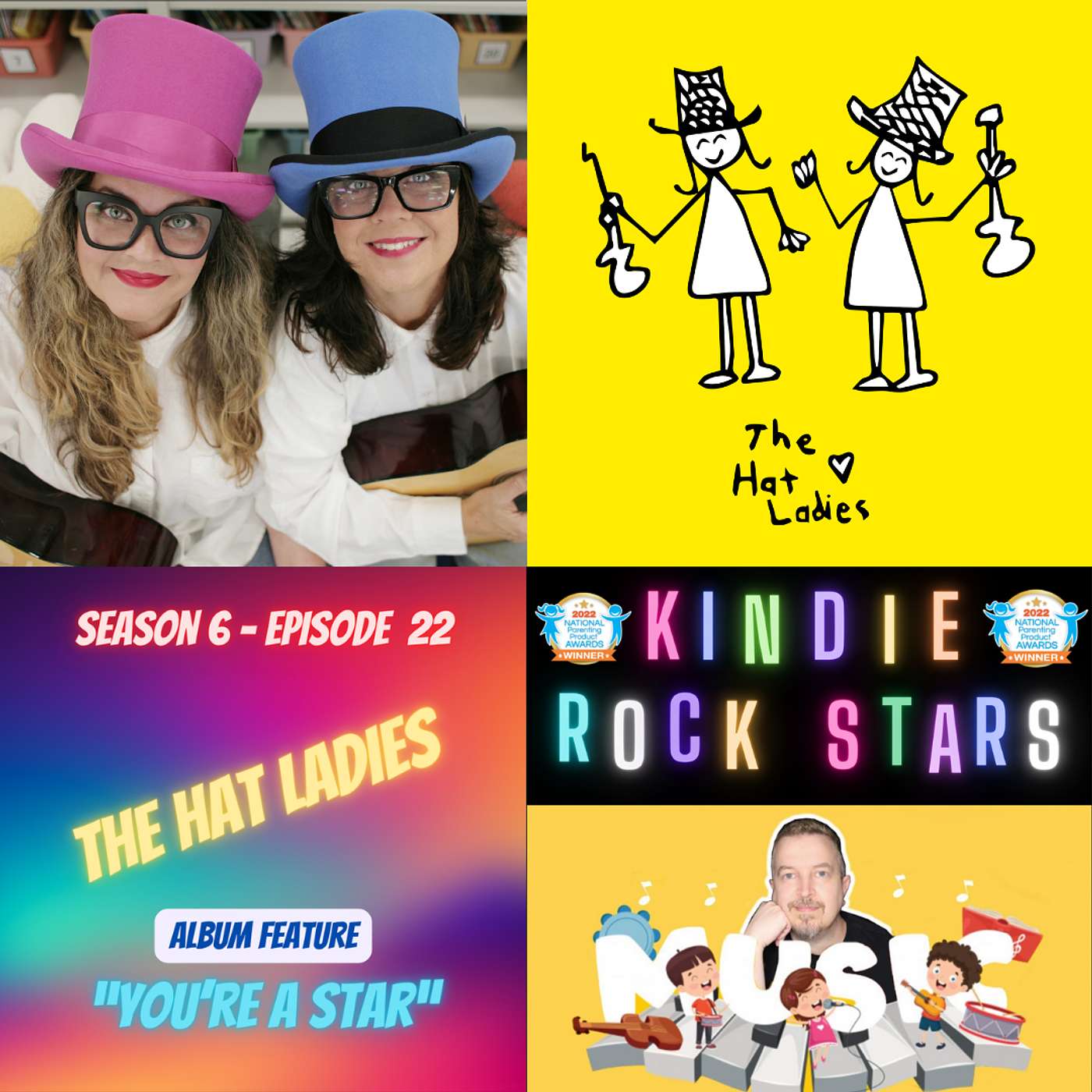 Lisa Joy Pimentel and Joanie Pimentel, known to us in the kindie community as The Hat Ladies, join the show to talk about their inspiration to make music for kids and families and tell stories about the making of their first album, You’re a Star as well as their new album called Hat Lady Magic. Have you seen the movie Jackpot! With John Cena and Awkwafina? If you did, you’ll have heard a Hat Ladies song, a wonderful cover of “It’s a Sunshine Day.” They share some songs from the You’re a Star album, including:
