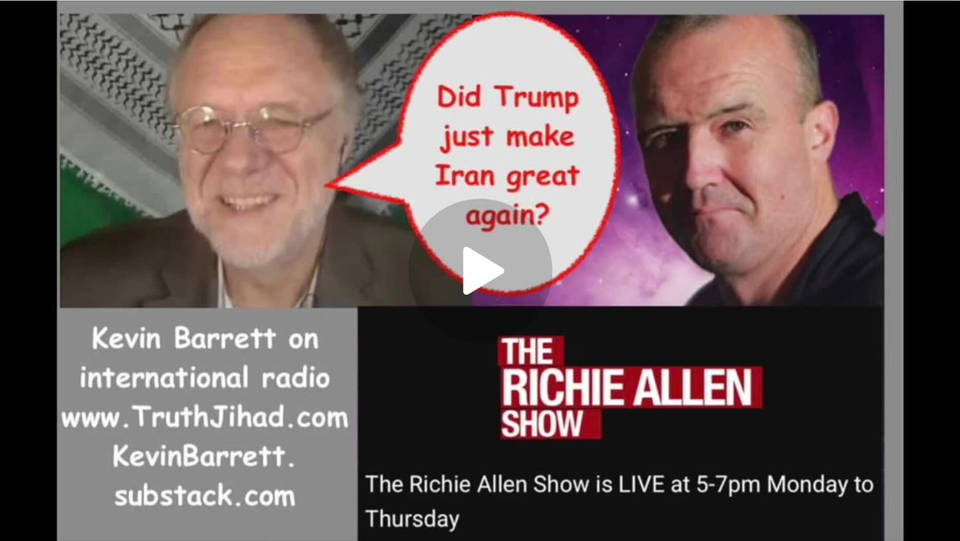 Richie Allen:Yeah, I mentioned my guest today is a friend of the programme. He’s a terrific broadcaster and writer. You’ll find his work at kevinbarrett.substack.com. He wrote a very, very well written piece on his Substack today (“Did Trump Just Make Iran Great Again?”) which he shared with me kindly before the programme, his take on what’s gone on. Let’s welcome him back. Kevin, it’s lovely to have you back on.