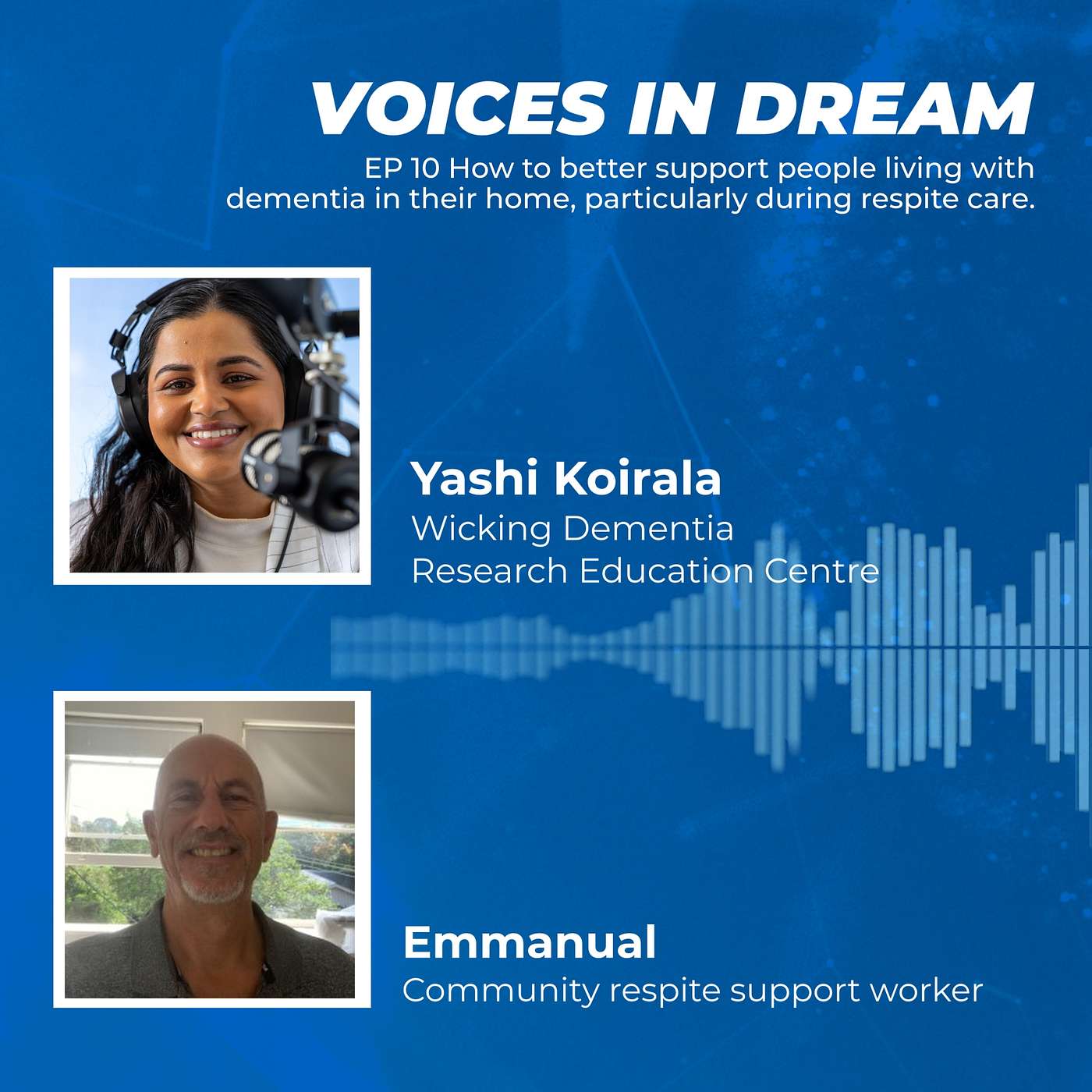 In this episode of Voices in DREAM, Emmanuel, an experienced support worker in community respite, shares practical insights on providing effective dementia support. He discusses what quality community respite care looks like, how support workers can better assist people living with dementia, and the value of strong support networks within the aged care workforce.