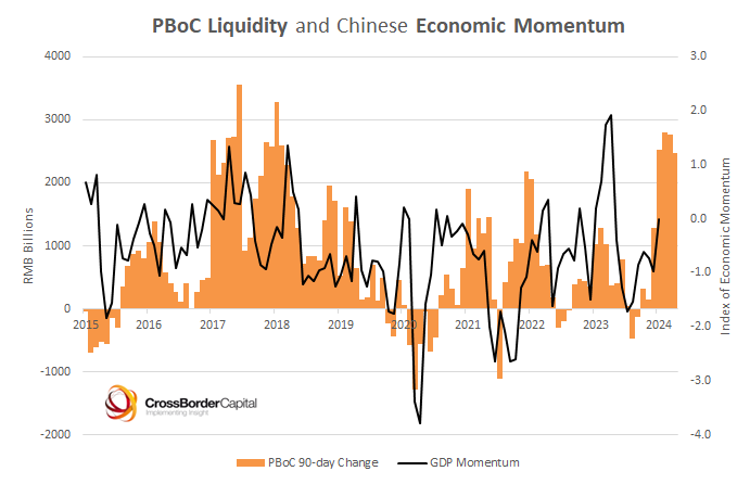 Why are they working so hard to keep liquidity high? As the folks at Crossborder Capital pointed out, China’s increasing liquidity creates positive GDP momentum.
