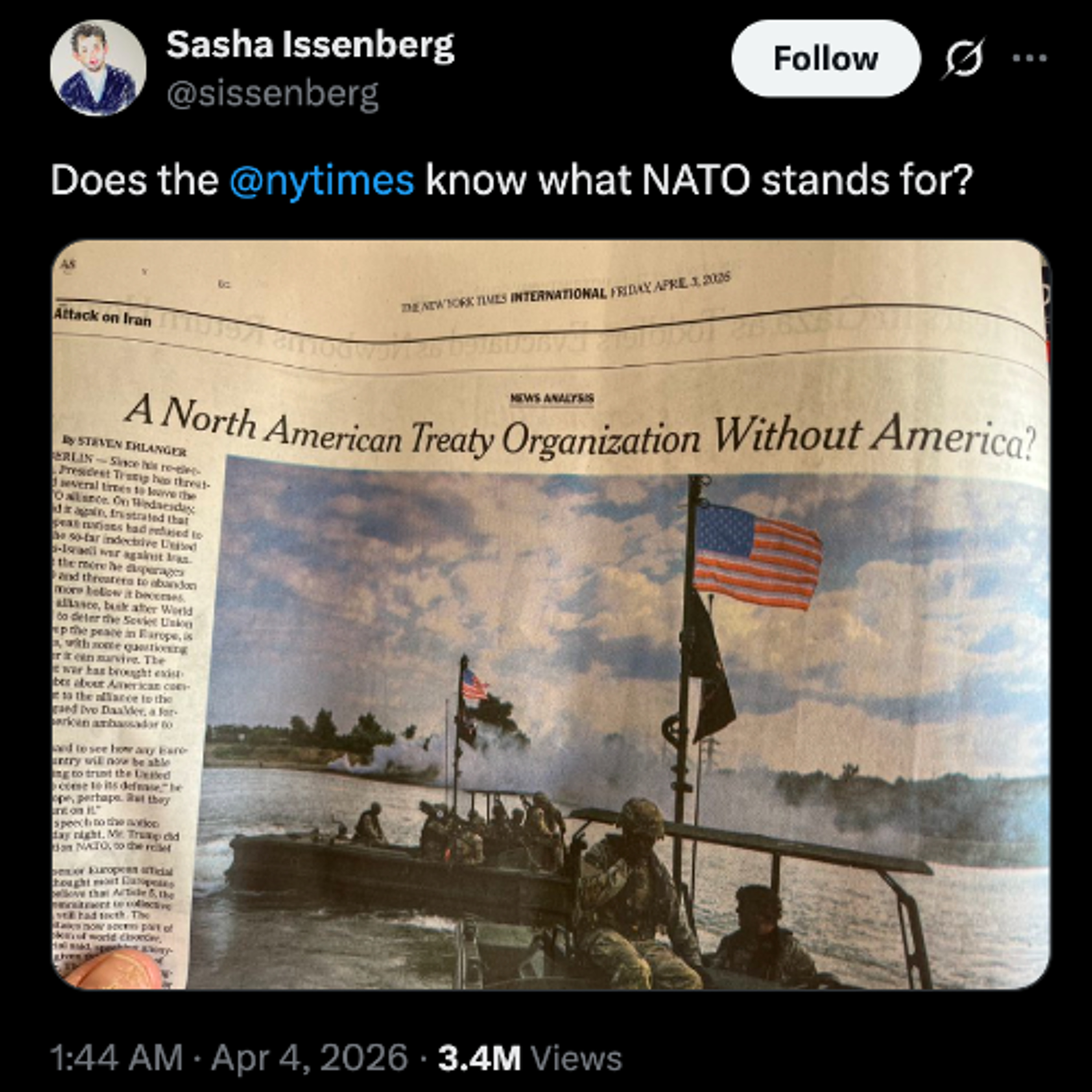 The New York Times has printed an article with the headline "A North American Treaty Organization Without America?", apparently having spent the entire Ukraine war completely unaware that NATO stands for North ATLANTIC Treaty Organization.