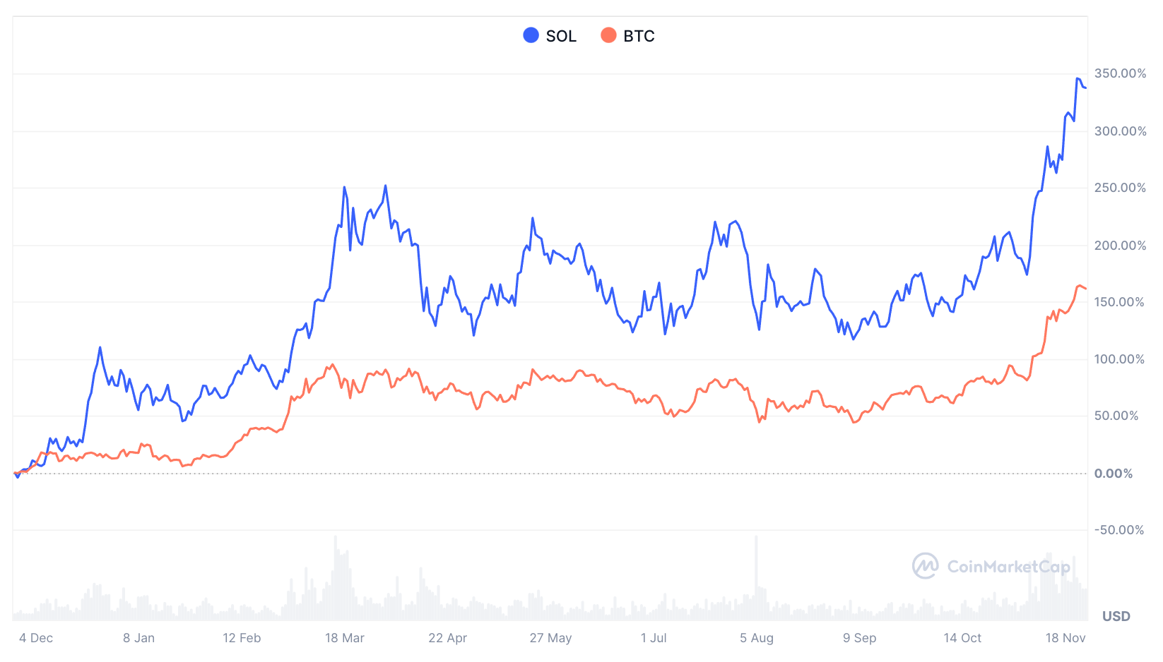 This is interesting because Solana has been outperforming bitcoin over the last year.
