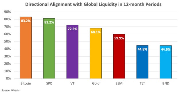 Why would you do that? Based on research from Sam Callahan and Lyn Alden, Bitcoin has become the global liquidity barometer. Their report points out “Bitcoin moves in the direction of global liquidity 83% of the time in any given 12-month period, which is higher than any other major asset class, making it a strong barometer of liquidity conditions.”