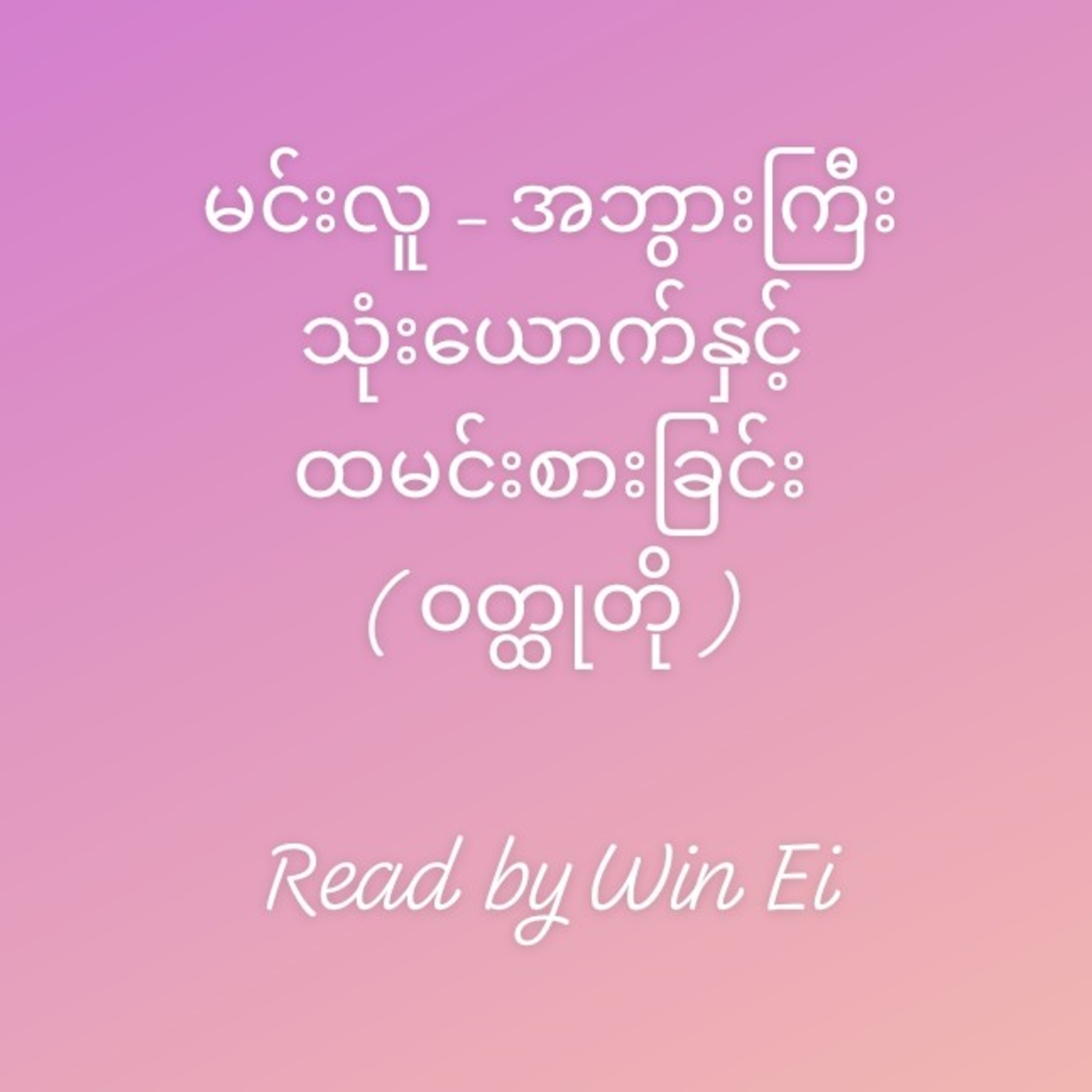 ဆရာမင်းလူရဲ့ "ဝတ္ထုတိုပေါင်းချုပ်"စာအုပ်ထဲက "အဘွားကြီးသုံးယောက်နှင့်ထမင်းစားခြင်း" ဆိုတဲ့ ဝတ္ထုတိုလေးကို အသံထွက်ဖတ်ပြထားတာပါ။ စာဖတ်ပြတဲ့ခါမှာ မှားယွင်းမှုတွေရှိခဲ့မယ်ဆိုရင်လည်း ကျွန်မတာ၀န်ဘဲဖြစ်ပါတယ်ရှင် 🤗