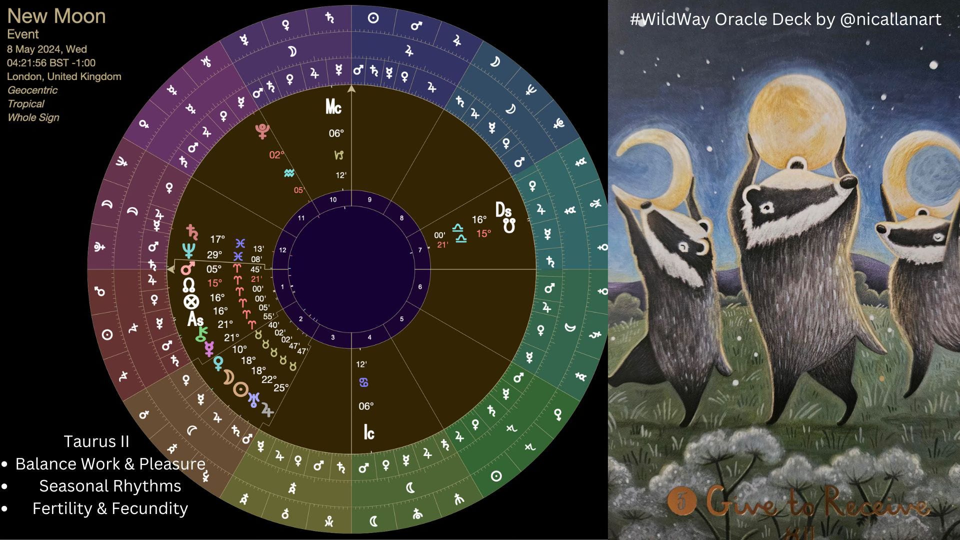 This New Moon falls in the decan of Taurus II, associated with balance and the natural rhythms of life. This emphasizes the importance of balancing work and pleasure, align with seasonal rhythms and fertility and fecundity.